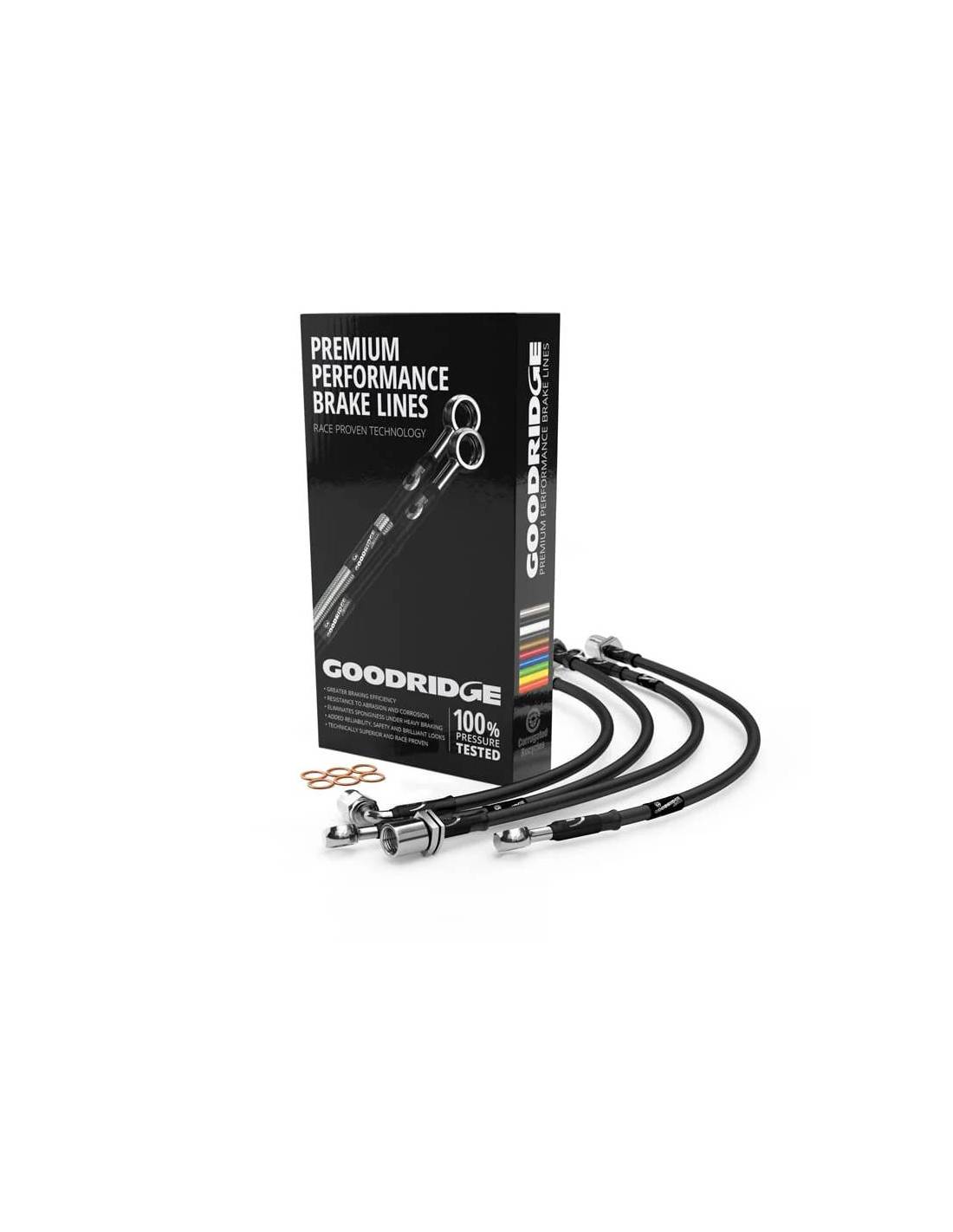 Cada KIT contiene los latiguillos necesários para sustituir la totalidad de su vehículo. La calidad Goodridge queda contrastada en cada uno de sus productos, además de cumplir con los más estrictos estándares de calidad cómo ISO9001, es el fabricante más usado en la alta competición, por ello cada vez que apuestas por Goodridge obtienes la mejor calidad y fiablidad del mercado.